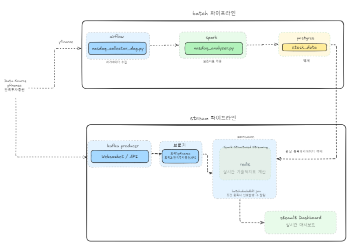 이 파이프라인은 배치 처리와 스트리밍 처리를 동시에 운영하는 람다 아키텍처(Lambda Architecture) 를 적용했습니다. 실시간으로 이동평균선(MA), RSI, 볼린저밴드 등을 계산하려면 당일 실시간 데이터만으로는 부족합니다. 예를 들어 200일 이동평균선을 구하려면 과거 200일치 종가 데이터가 반드시 필요합니다. 이를 매번 스트리밍쪽에서 구현하기에는 데이터 호출제한에 걸리게 됩니다. 이를 해결하기 위해 Batch 레이어에서 축적한 히스토리컬 데이터를 Speed 레이어의 실시간 계산에 결합하는 구조를 사용합니다.