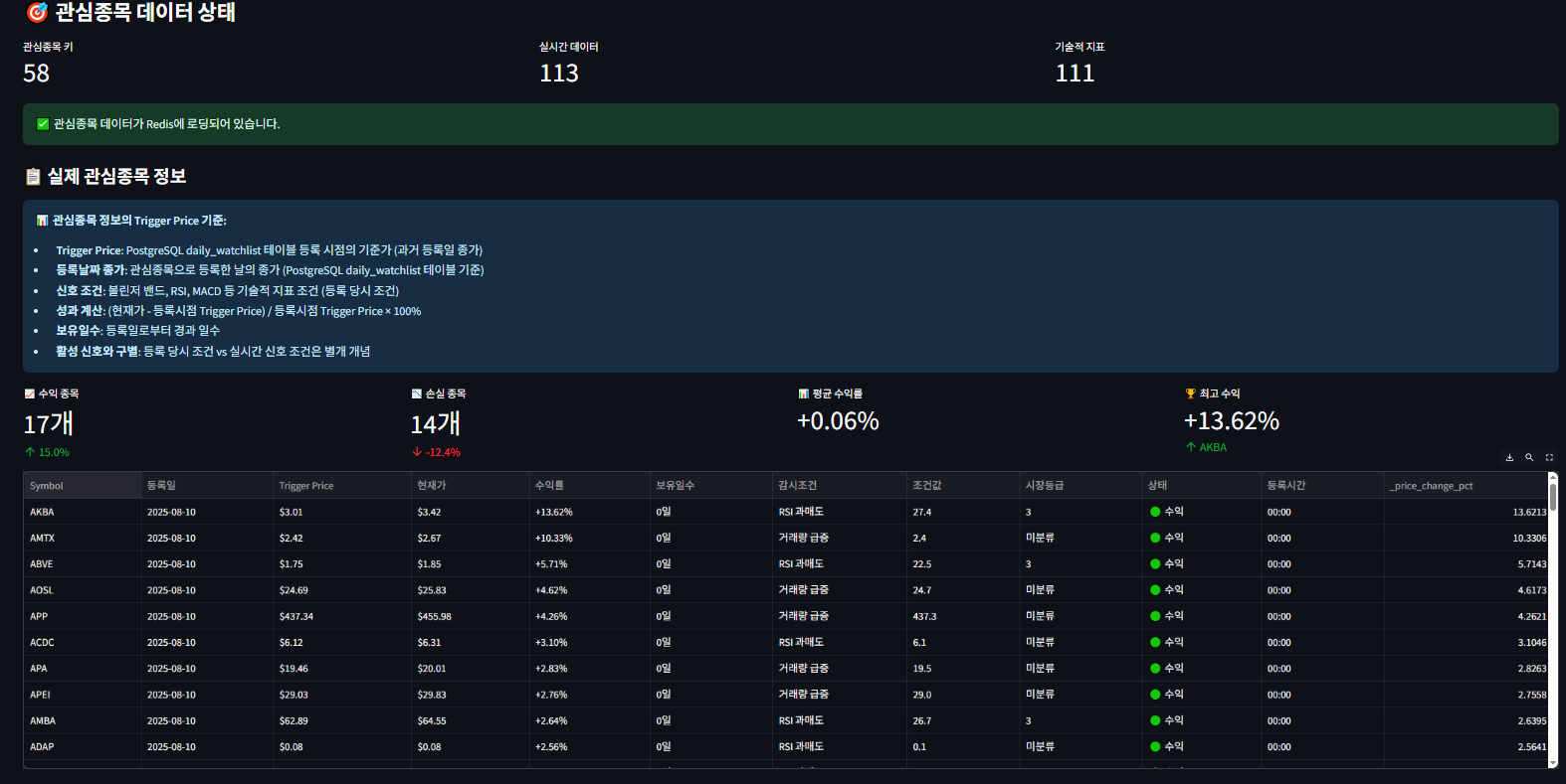 - 05_실시간_Redis_모니터링.py : 관심종목 실시간 가격 추적, 기술적 신호 모니터링 (1초 자동 새로고침)
