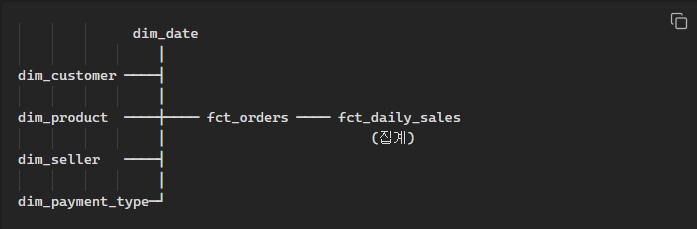 - 5개 차원 테이블(dim) + 2개 팩트 테이블(fct)